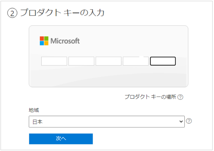 Office 2019 のダウンロードに必要な25文字のプロタクトキーを入力し、「日本」を選択し、「次へ」をクリックします。