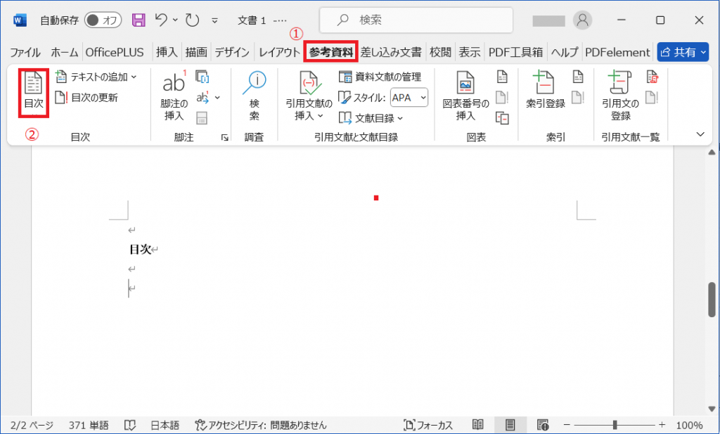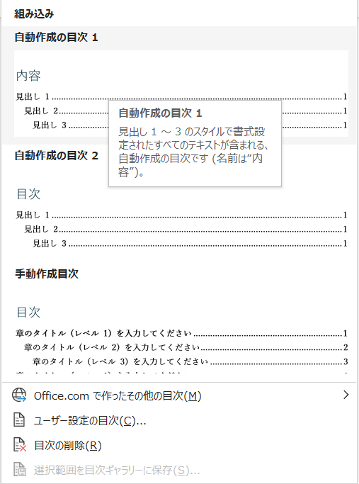 「自動作成の目次1」か「自動作成の目次2」をクリックすると目次が作成されます。