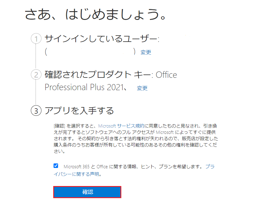 セットアップしたOffice製品を確認し、「Office Professional Plus 2021」と表示されていると、【確認】ボタンを押します。