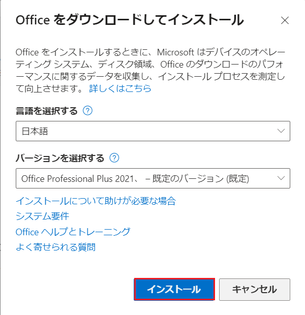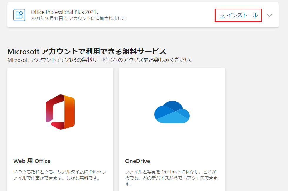 Microsoft アカウントページに移動し、「Office Professional Plus 2021」の右にある【インストールする】ボタンを押します。