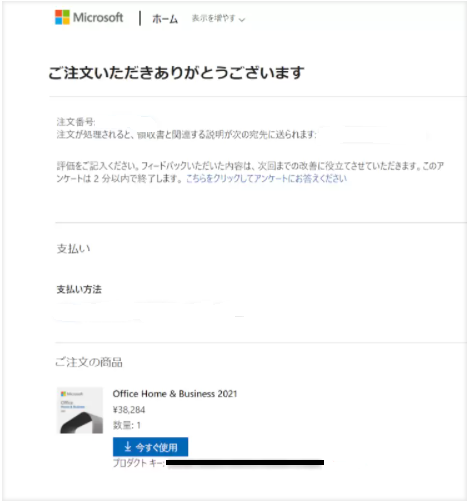 Microsoft 公式サイトでOffice 2021を買った場合、ページにOfficeのプロダクトキーが表示されます。
