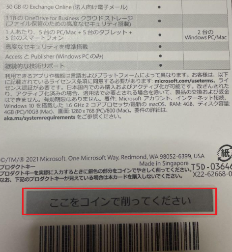 Office 2021のPOSAカード版またはプレインストール版を購入した場合、カードの裏側に、初インストール用のプロダクトキーが書かれています。